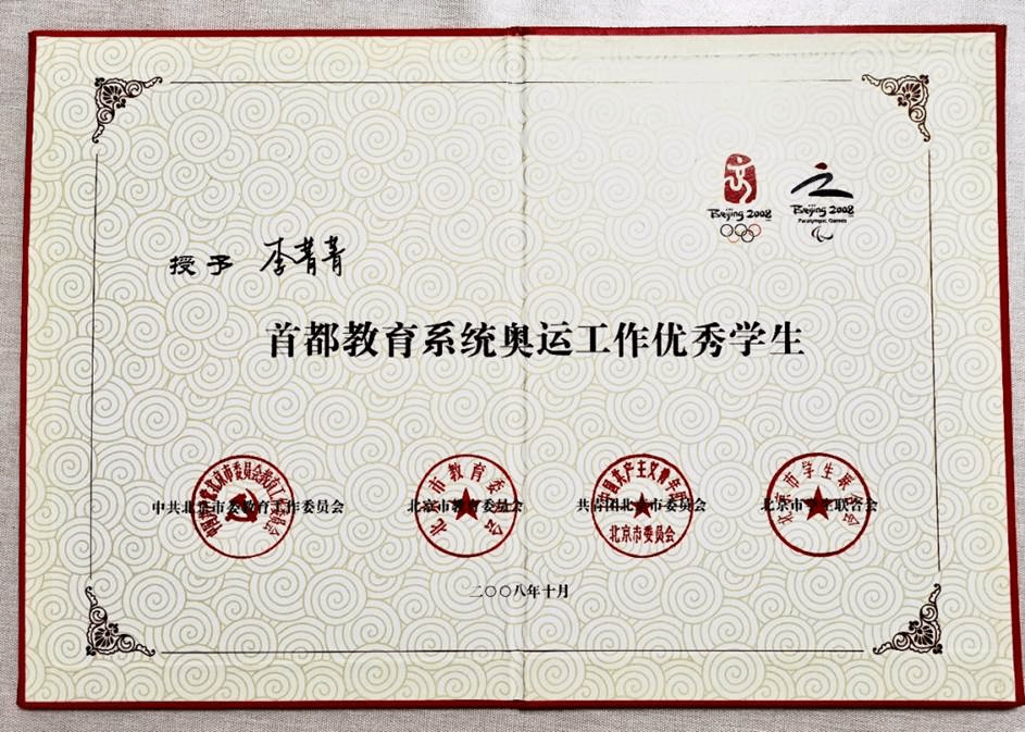 2008年奥运会结束后,我作为一名北外学生志愿者,获得了中共北京市委教育工作委员会、北京市教育委员会、共青团北京市委员会和北京市学生联合会颁发的“首都教育系统奥运工作优秀学生”荣誉称号。这份荣誉也更加坚定了我学好专业知识,努力践行北外“兼容并蓄,博学笃行”的校训,做一个党和国家需要的语言工作者的决心。