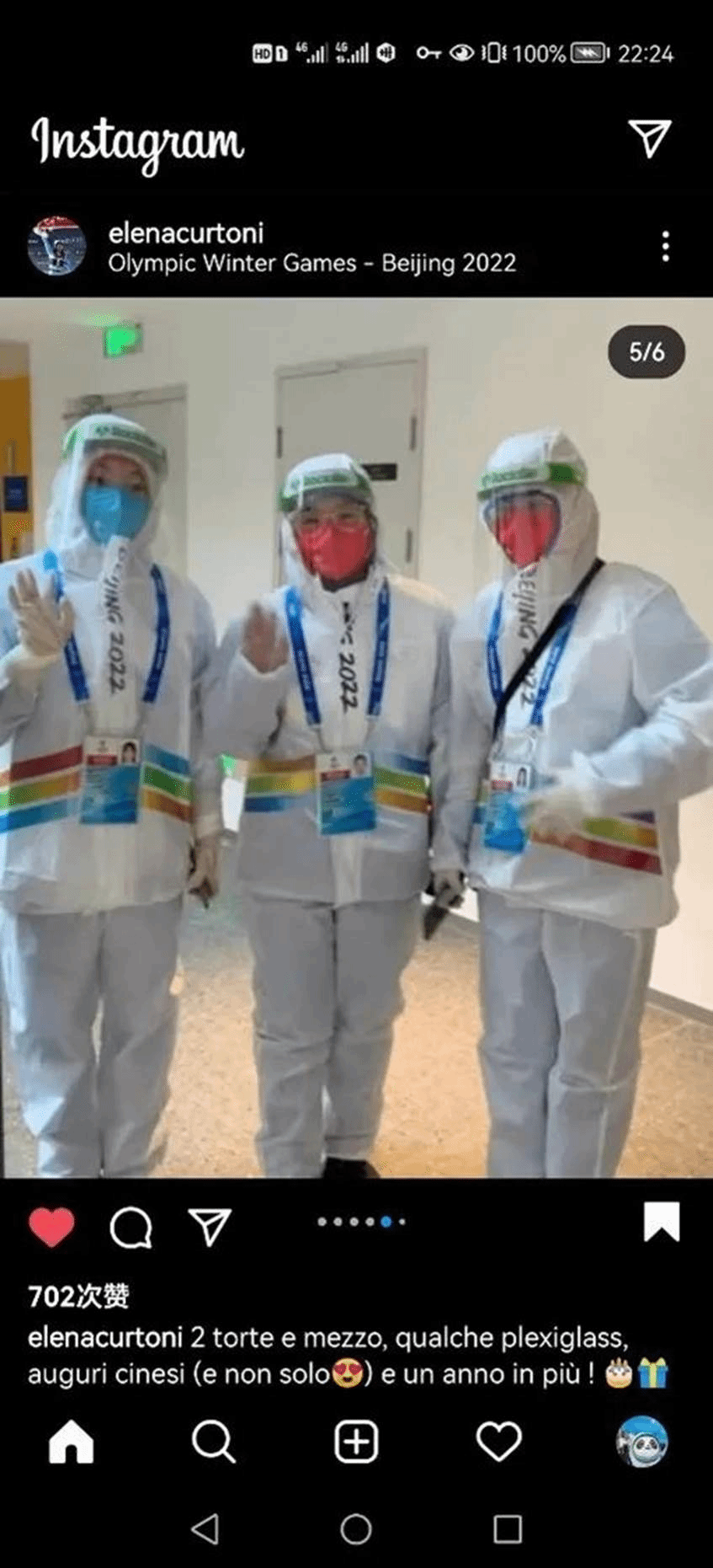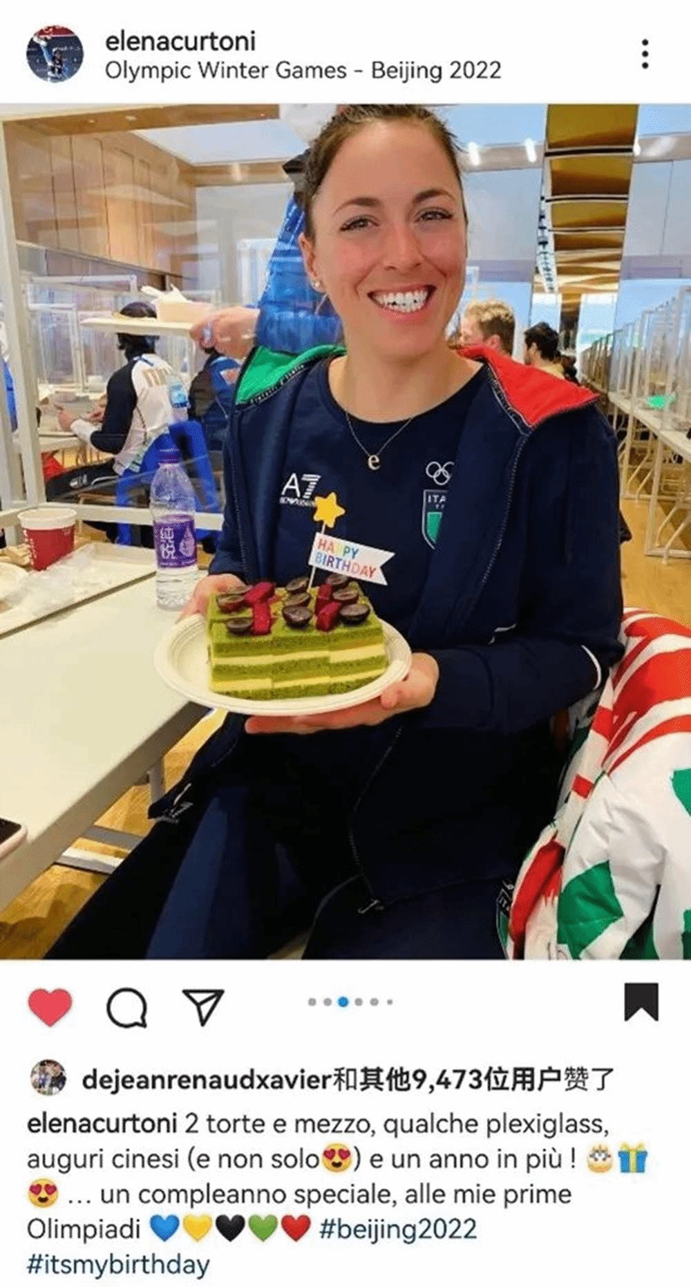 2022年2月3日,意大利代表团的高山滑雪运动员Elena Curtoni在延庆冬奥村度过她的生日。意大利代表团助理提前向餐饮服务台预订了生日蛋糕,并联系了她的教练确认将蛋糕送达的时间。2月3日下午1点,代表团助理、北外伟德bv国际体育意大利语专业学生操兰漪、和另外两名代表团助理程茗玥、郝聪慧取到蛋糕,送往她的房间并用意大利语向她祝福生日快乐: “Buon compleanno!” Elena高兴地在社交平台Instagram上发布了助理们送上生日祝福的视频,并写道:“2 torte e mezzo, qualche plexiglass, auguri cinesi(e non solo), un compleanno speciale, alle mie prime olimpiadi.”(在我参与的第一届奥运会上,度过了一个特别的生日:收获了两块蛋糕,一些很棒的礼物以及来自中国朋友们的祝福)