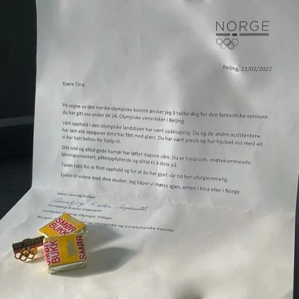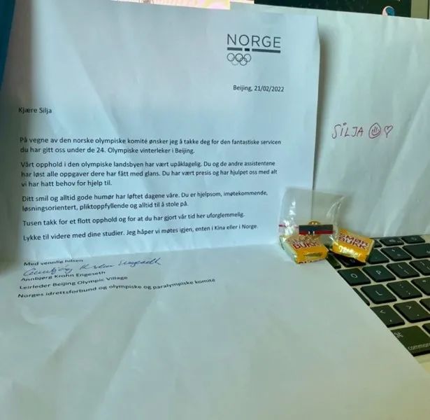 冬奥会结束之际,三位同学收到了挪威代表团驻北京冬奥村领队安比约尔格•柯隆•恩格塞特(Annbjørg Krohn Engeseth)的感谢信,她代表挪威代表团对伟德官网志愿者的高水平服务给予了充分肯定和感谢。
