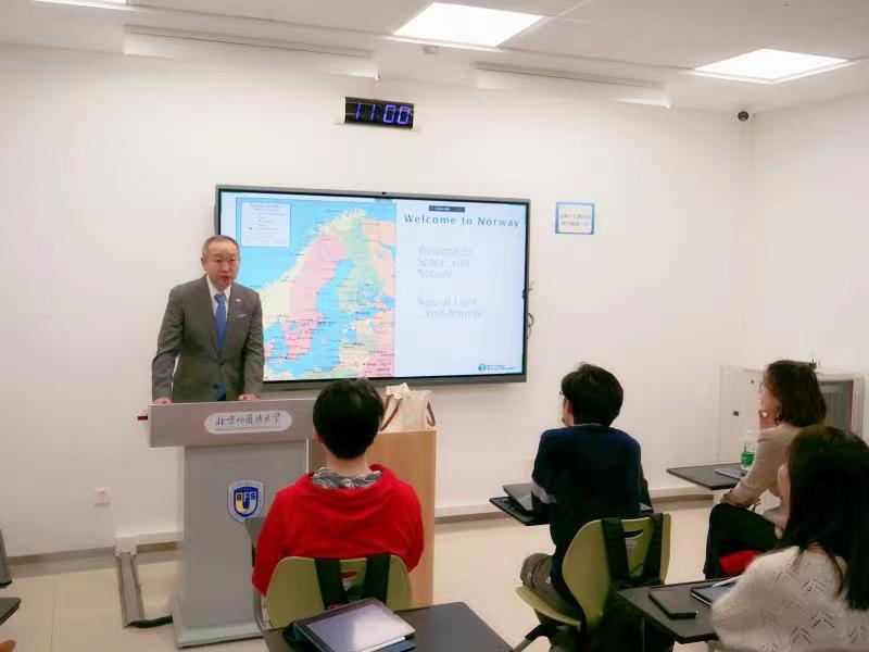 与学院领导会面后,郭建先生在挪威语专题讨论课上进行了《传统能源强国挪威的绿色能源转型》主题讲座。他向挪威语专业师生介绍了挪威国家能源商会、挪威能源资源储备情况和挪威政府能源转型计划等内容。在互动问答环节中,郭建先生结合具体的案例认真回答了同学们的多个问题,包括挪威石油产业的状况、中挪未来能源合作的前景、挪威绿色金融的发展和中挪自贸协定谈判等内容。