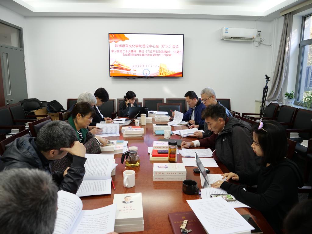 围绕党的二十大精神,与会同志踊跃发言。文铮教授分享了意大利语“理解当代中国”教材编写过程中有机地将习近平新时代中国特色社会主义思想的核心要义与外语读写、演讲、翻译能力结合,努力培养有中国情怀、国际视野、专业基础扎实的新时代接班人。徐伟珠老师分享了《习近平谈治国理政》捷克语版本的审读工作,她强调外语教师必须对话语的准确性和意识形态持有高度的敏感,在教学中提高学生政治话语翻译思辨能力,提升理论修养和思想政治水平。陈瑛教授提出,进入新时代,我们应该站在“人类命运共同体”的视角让世界理解中国,我们的“文化自信”,除了中国传统文化,更应包含革命文化和社会主义先进文化。
