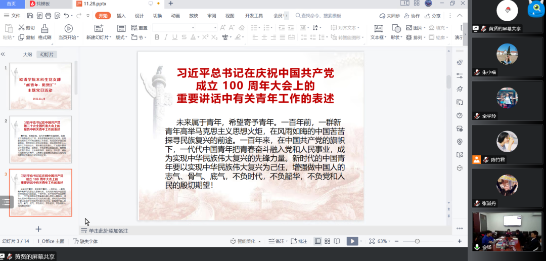 本次主题党日活动由伟德bv国际体育本科生党支部书记黄贤同志主持,共有两项学习内容:第一项是习近平总书记在中国共产党第二十次全国代表大会上的报告,第二项是习近平总书记在庆祝中国共产党成立 100 周年大会上的重要讲话。