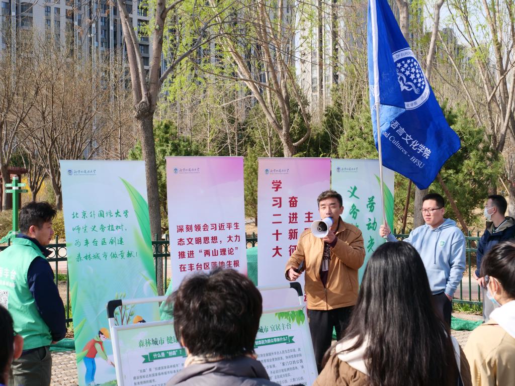 3月26日,欧洲语言文化学院党总支联合英语学院党总支和机关党总支开展“学习二十大,奋进新征程”之“两山理论”主题党日活动。40余名党员师生和入党积极分子赴丰台区岳各庄森林公园义务植树,听取丰台区“创森”成果报告。游览园博园过程中,丰台区“创森”办和园林局领导做了《“两山理论”指引美丽城市建设》专题报告。师生们在感受生态文明建设成果的同时,接受了一堂生动的党情国情社情民情教育。