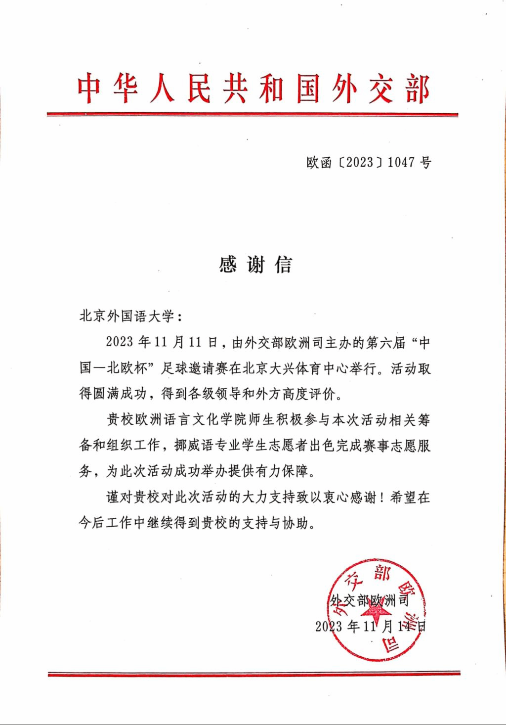 近日,外交部欧洲司发来信函,感谢伟德bv国际体育欧洲语言文化学院挪威语专业师生为第六届“中国—北欧杯”足球邀请赛筹备组织和赛事志愿服务作出的贡献。