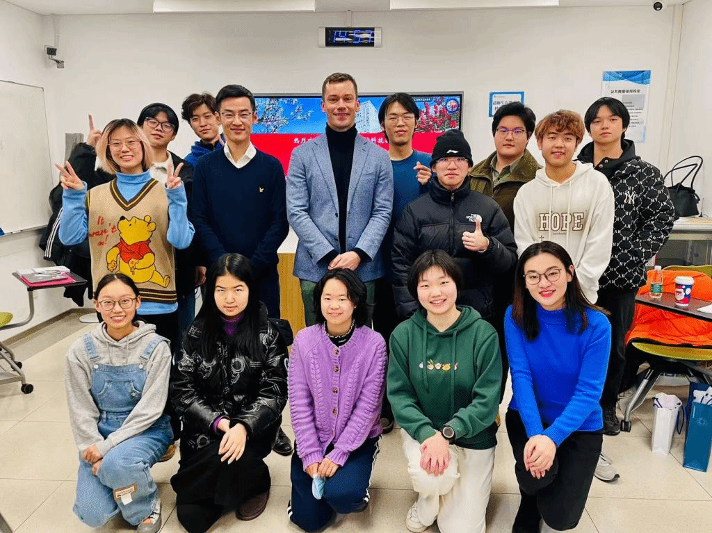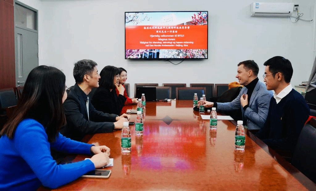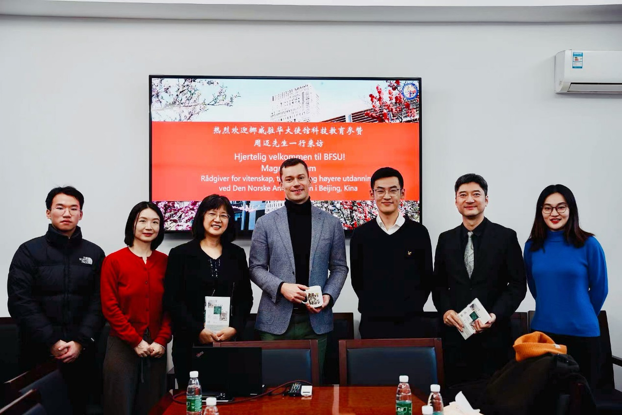 12月19日下午,挪威王国驻华大使馆科技及教育参赞周迈先生(Magnus Jorem)应邀做客伟德bv国际体育,与柯静院长、董希骁副院长及挪威语专业余韬洁、李菁菁老师深入交流,参加挪威概况课教学活动。