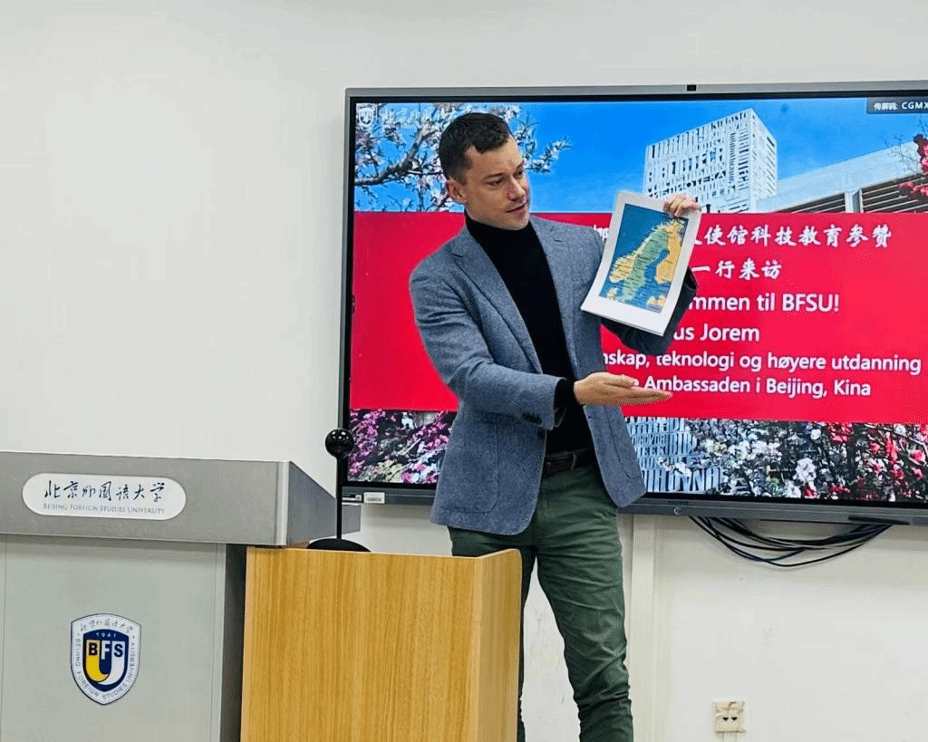 会面活动后,周迈参赞前往逸夫楼与2023级挪威语专业学生共同上了一堂“挪威概况课”。同学们用较为流利的挪威语进行自我介绍,邀请周迈参赞演唱《索尔维格之歌(Solveigs sang)》《坐在谷仓里的圣诞老人(På låven sitter nissen)》两首经典挪威语歌曲。周迈参赞为同学们简要介绍了挪威的社会文化、教育科研、经济发展等方面情况,与同学们进行了精彩的问答互动。