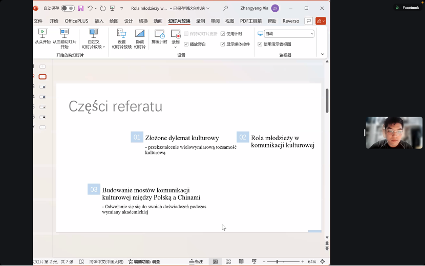 夏张洋在开幕式环节以“中波青年在两国文化交流中的建设性作用”(Rola młodzieży w budowaniu mostów kulturowych między Polską a Chinami we współczesnym kontekście kulturowym)为题发言,以在全球化背景下不同民族所遇到的文化困境为切入点,讨论了青年对于全球文化认同塑造的关键性作用,并以自身在中波文化交流中的经历为例,针对两国青年文化素养提升和高校文化活动改进提出建议。
