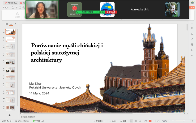 马子涵在“文化与文学”板块以“中波建筑中的哲学思想对比”(Porównanie myśli filozoficznej w architekturze chińskiej i polskiej)为题发言,通过对比中国封建时期和波兰转型前具有代表性的古建筑特点,总结两国透过不同历史时期、不同类型的建筑所展现出的哲学思想异同。